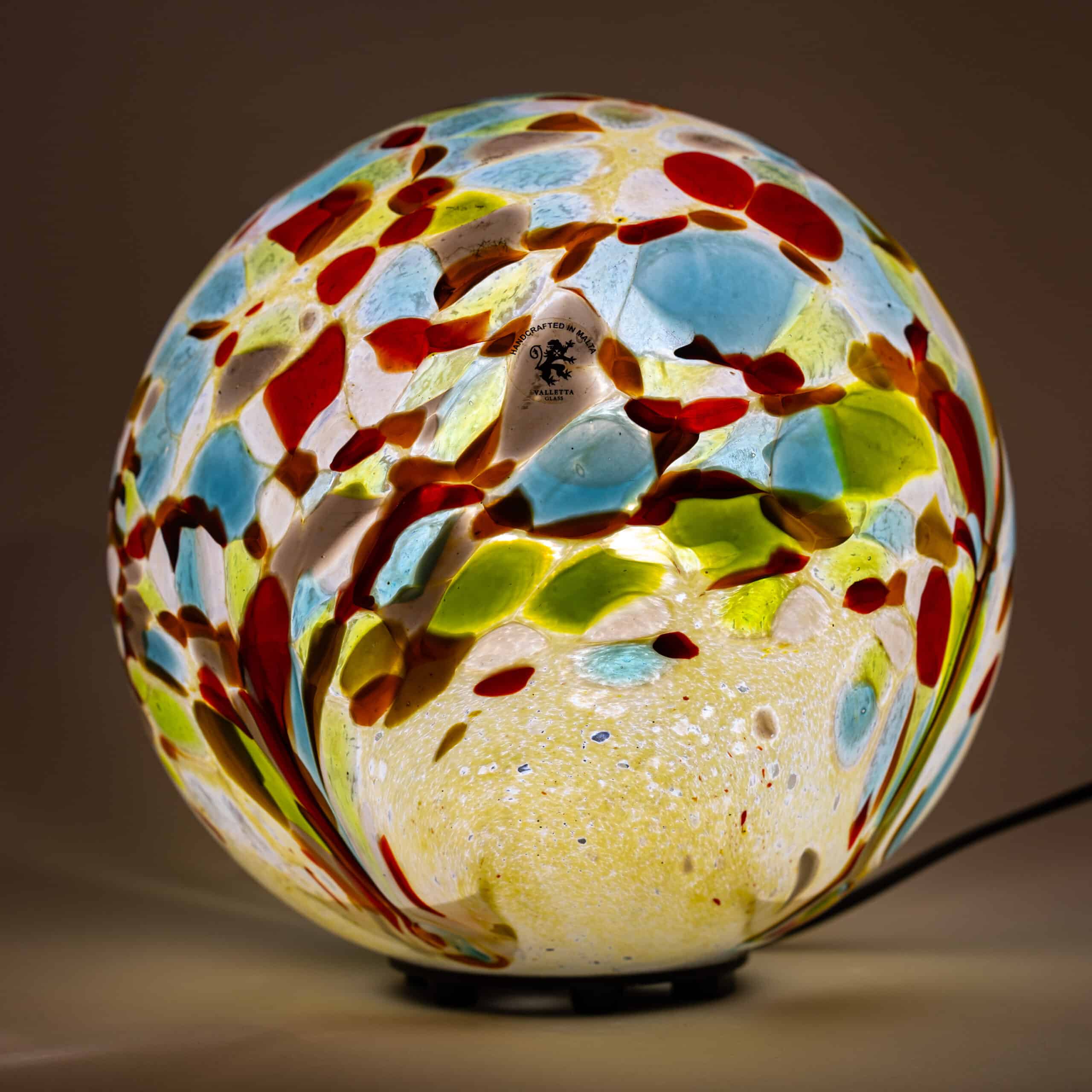 Each round glass lamp showcases a unique, vibrant design, available in eight stunning colours: white pearl, red pearl, blue pearl, sand and sky, rainbow cream, sunset in the desert, noble pink, and blue lagoon.